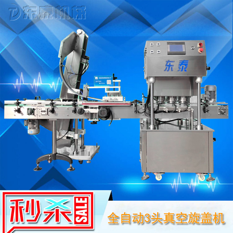 該直線式真空旋蓋機(jī)是東泰機(jī)械結(jié)合用戶使用的情況,摒棄了傳統(tǒng)轉(zhuǎn)盤式真空旋蓋機(jī)的弊端,研制開發(fā)的新型高效設(shè)備,設(shè)備自動檢測到兩個瓶子蓋子進(jìn)入到雙頭真空旋蓋機(jī)內(nèi),旋蓋機(jī)彩色顯示屏?xí)?shí)時顯現(xiàn)旋蓋狀況,整機(jī)多點(diǎn)檢測,當(dāng)進(jìn)口無瓶無蓋、出口堵塞、定位不準(zhǔn)、瓶身傾倒均自動停機(jī)。單個旋蓋頭達(dá)到的真空度都可以單顯示,單調(diào)整