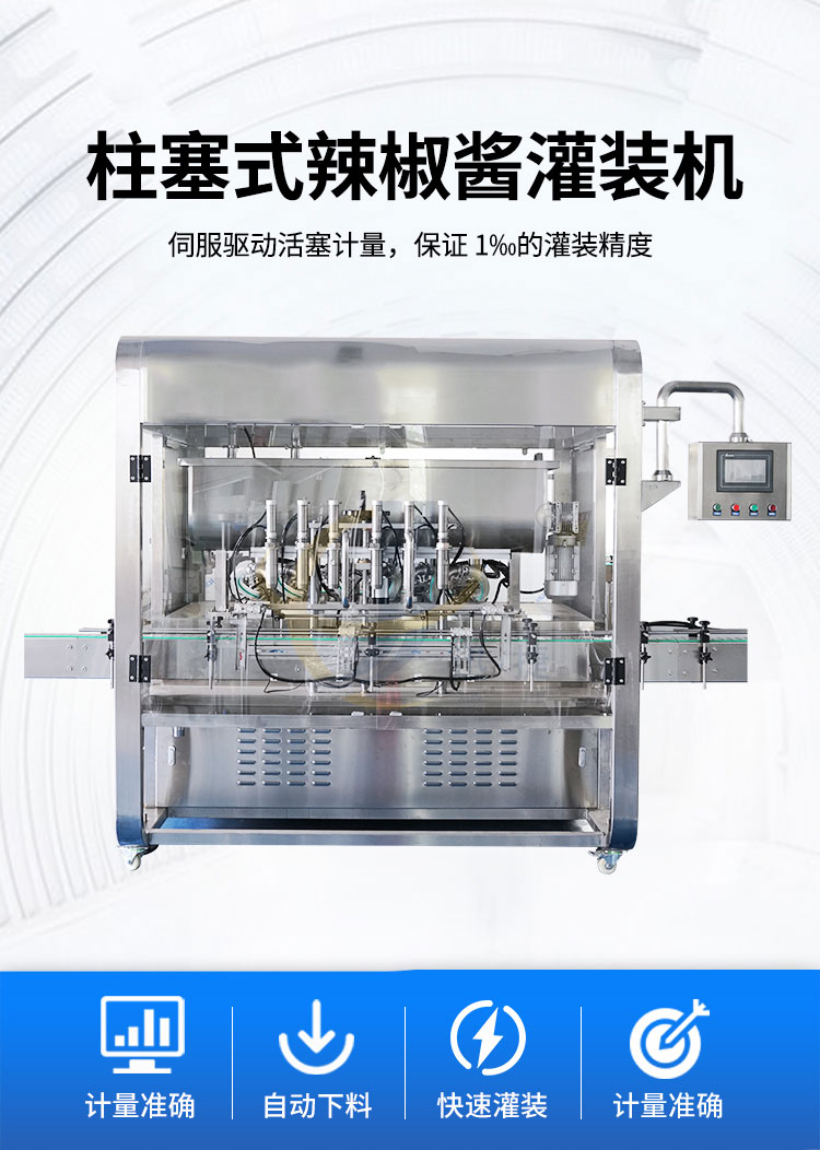 辣椒醬灌裝機(jī)采用活塞式灌裝原理,適用于調(diào)味品中帶顆粒并且濃度較大的辣椒醬、豆瓣醬、花生醬、香菇醬、果醬、牛油火鍋底料。