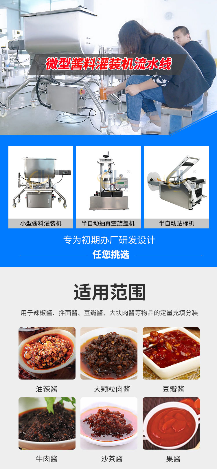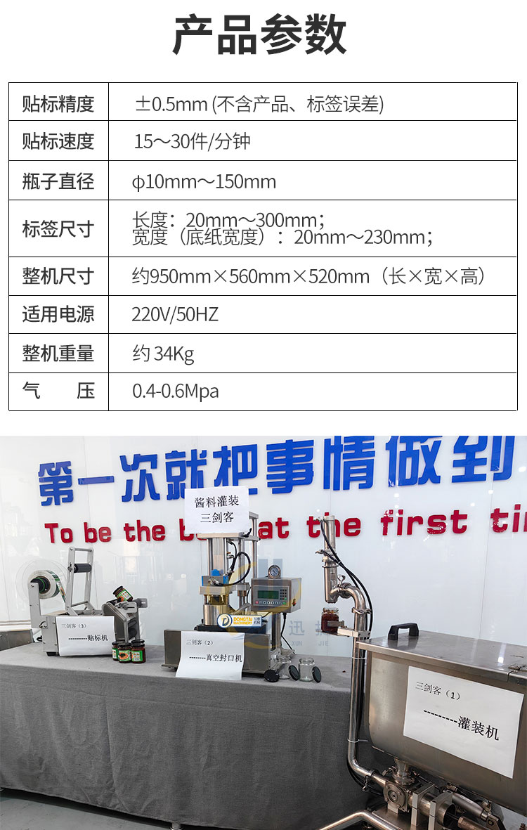 小型醬料灌裝生產線又名醬料灌裝三劍客,由半自動醬料灌裝機+半自動真空旋蓋機+半自動圓瓶貼標機組合而成。