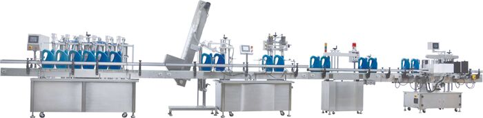 灌裝機+提蓋理蓋機+旋蓋機+鋁箔封口機+貼標機